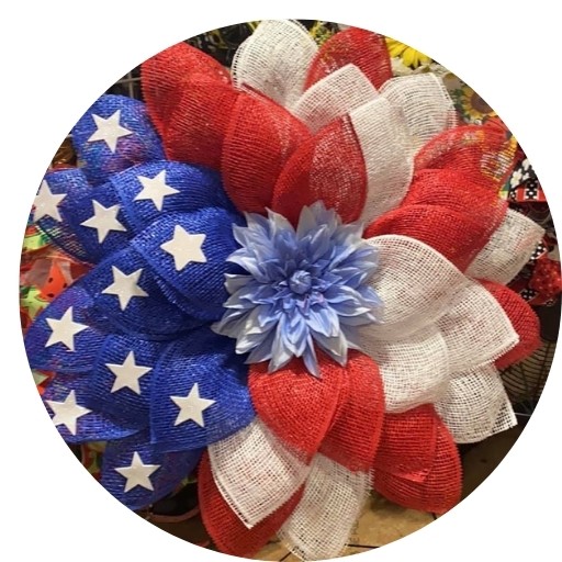 Oh Beautiful with spacious skies!! Celebrate the 4TH with this American flag themed pancake style wreath made with poly burlap mesh and a beautiful flower center. (Centers come in different styles to choose from) Fits conveniently between a screen door and regular door.